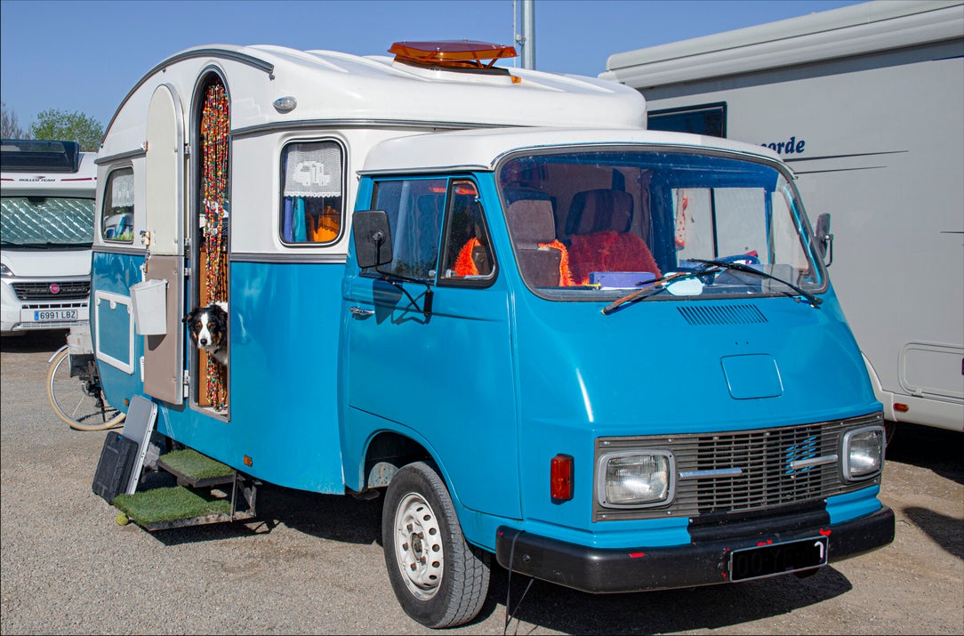 Deze ""handgebouwde" camper bestaat uit een caravan en een oude ..\Mercedes. De eigenaar wil niet op de foto, de hond graag.