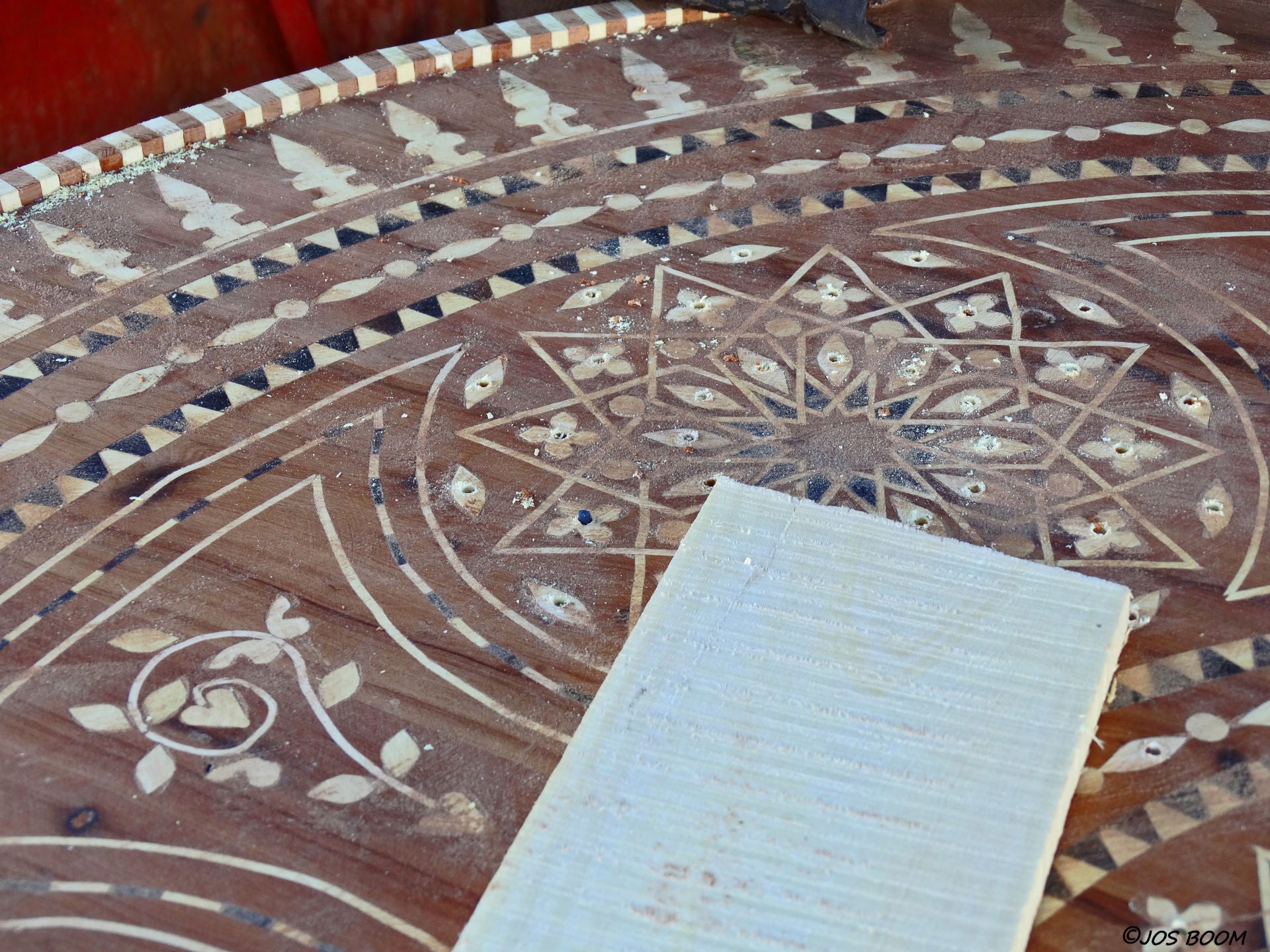 Het rijk gedecoreerde tafelblad is uiteraard van hout. Alle inlegmotieven zijn van verschillende andere houtsoorten, het stuk hout op tafel is van een citroenboom, mooi vrijwel wit hout.