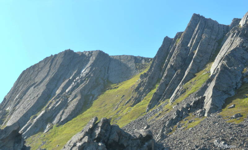 Noren, in ieder geval die in het noorden, hebben de slordige gewoonte onbruikbare technische apparaten te laten voor wat ze zijn. De stukken roest die ik hier op de foto zette zijn mogelijk onderdeel van een oud schip, al dan niet ter plekke op de klippen gelopen, en dat roest daar dan langzaam weg. Opruimen is er niet bij.