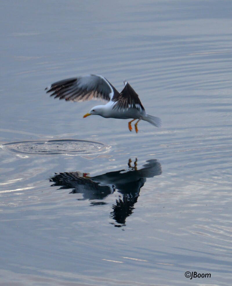 Vóór het weer verslechtert is de zee redelijk glad, zo glad dat laag vliegende meeuwen een spiegelbeeld in het water hebben.