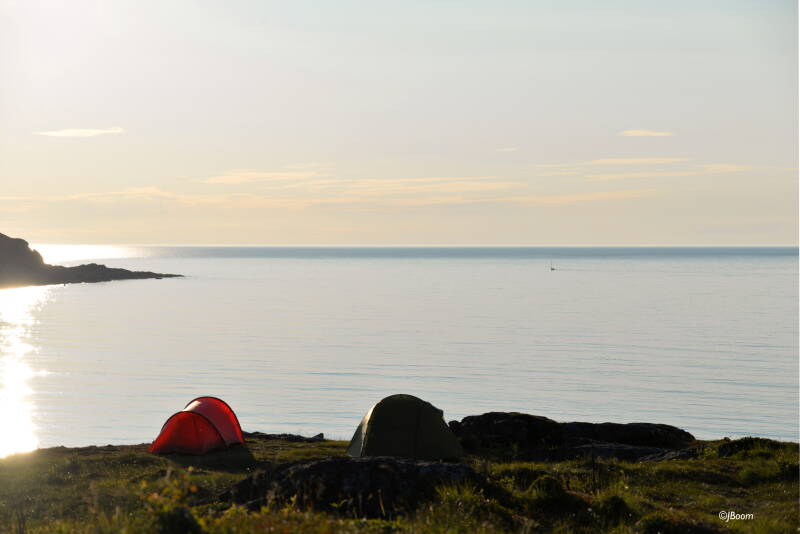 's Avonds gaan we naar de zee en de niet-zonsondergang kijken. We zijn zeker niet alleen. Tientallen Noren komen ook kijken, dit weer komt echt niet heel vaak voor. Het sterft er natuurlijk van de muggen. Hele gezinnen komen met tentjes, matjes, slaapzakken, en wat je maar bij je wilt hebben op zo'n superscene.