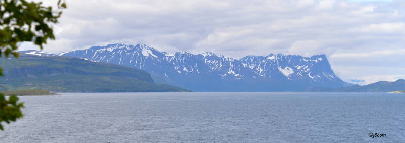 Na de wandeling hebben we Harstad wel gezien, een leuk, relaxed stadje met een aangename sfeer. We rijden 18 km naar een parkeerplaats aan het water, de zee. Langzaam betrekt het en tegen half 4 begint t zachtjes te regenen. Voor het zover is genieten we van het uitzicht, de horden vissen die boven het water uit springen en zowaar een bruinvis, die zich vermoedelijk tegoed doet aan de vissen. Ondanks dat we heel veel vissen zien springen lukt het niet er ook maar één compleet in beeld te krijgen, ze zijn niet erg groot en wel erg snel en ze duiken, letterlijk, op op de plak waar je net niet door je camera kijkt. Je hebt dus hooguit het staartje te pakken.