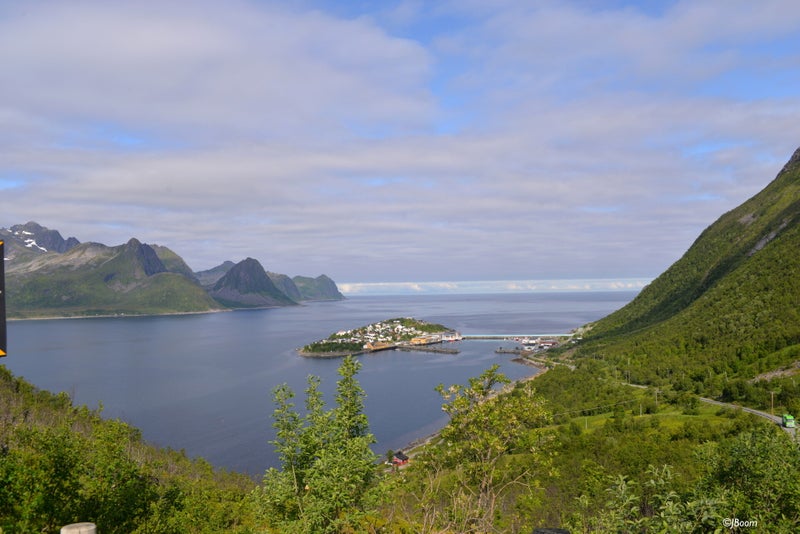 De boottocht benutten we om kranten te downloaden, prima wifi aan boord en buiten is het gewoon noord Noorwegen, zee en bergen. Dit is het eerste stadje op het eiland Senja ,het eiland waar we heen gaan. Senja is een buitengewoon mooi en ruig eiland, de weerberichten zijn bovendien zon voor de komende dagen, dus we hopen hier ook van mooi weer te kunnen genieten. We rijden naar een CP bij een kerkhof, maar die blijkt vol.