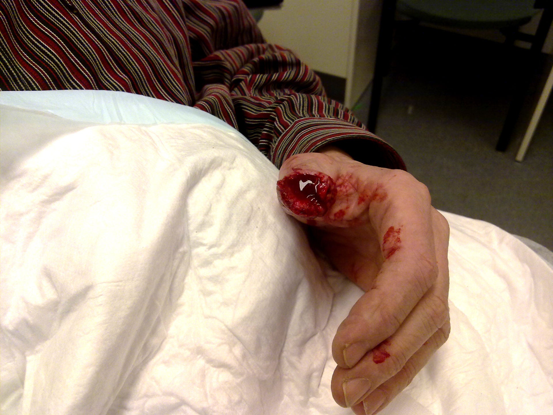 Vlak voor kerst 2010 zaagde ik met een cirkelzaag een stukje, net tot onder de nagel,