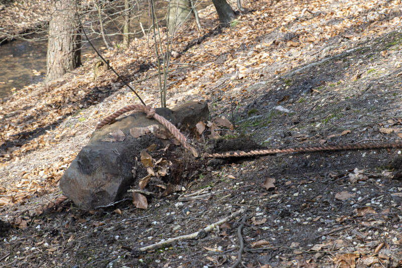 Via de Loenermark fietsen we naar de sprengen, daar zijn een paar mannen bezig een stuk bazalt, losgeraakt uit een van de wanden, naar boven te slepen. De kabel is aan een trekker vastgemaakt.
