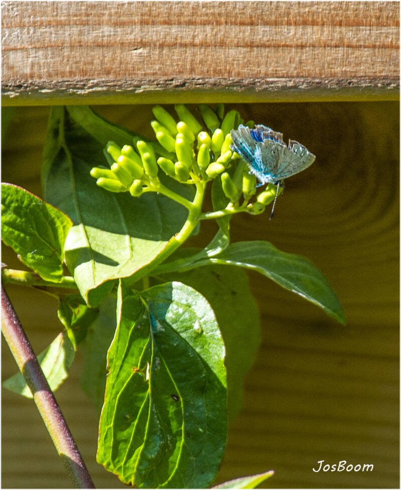 30-05-2021, In de tuin van Ginie. Mezen bij het nest en een blauw vlindertje op de schutting, een duif komt ook even langs
