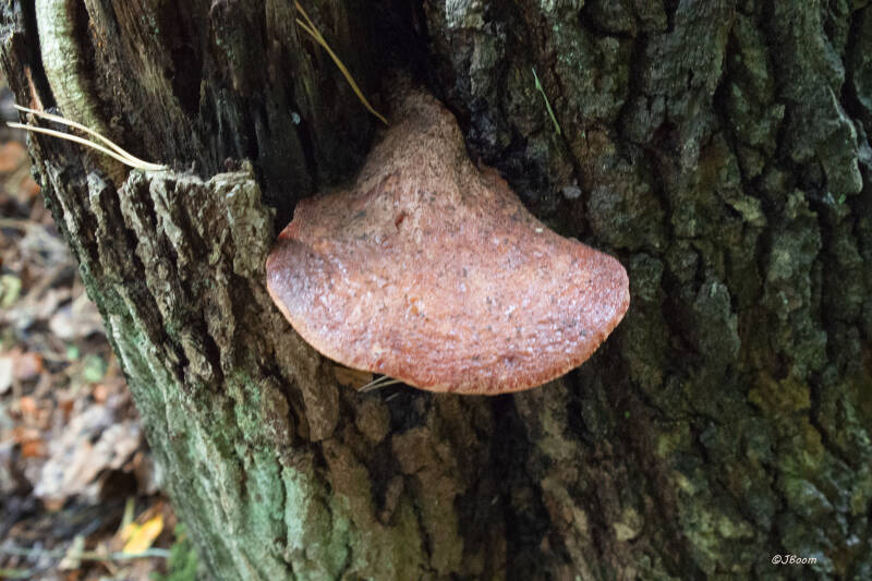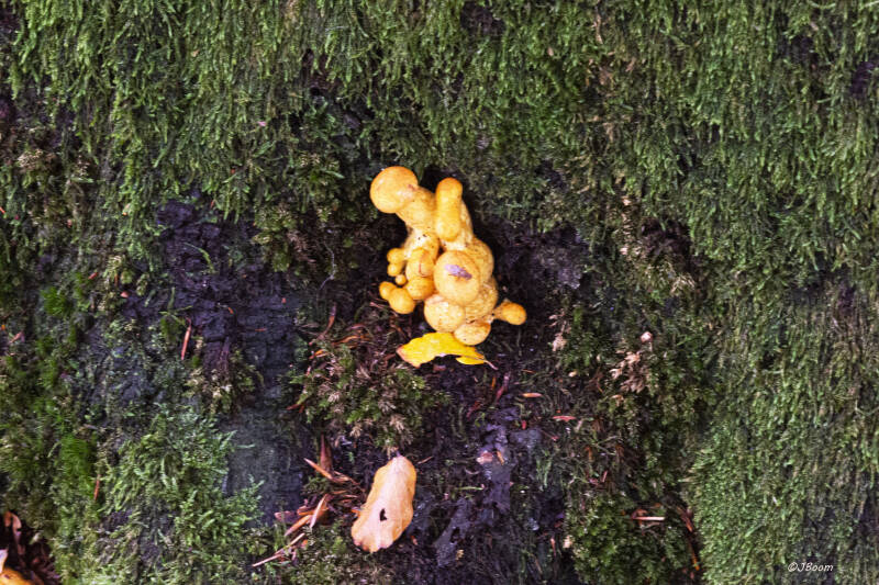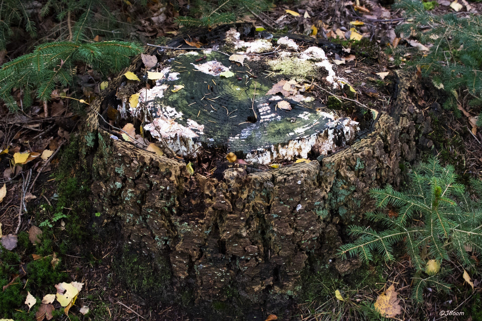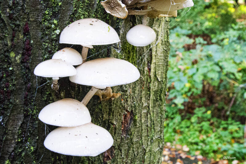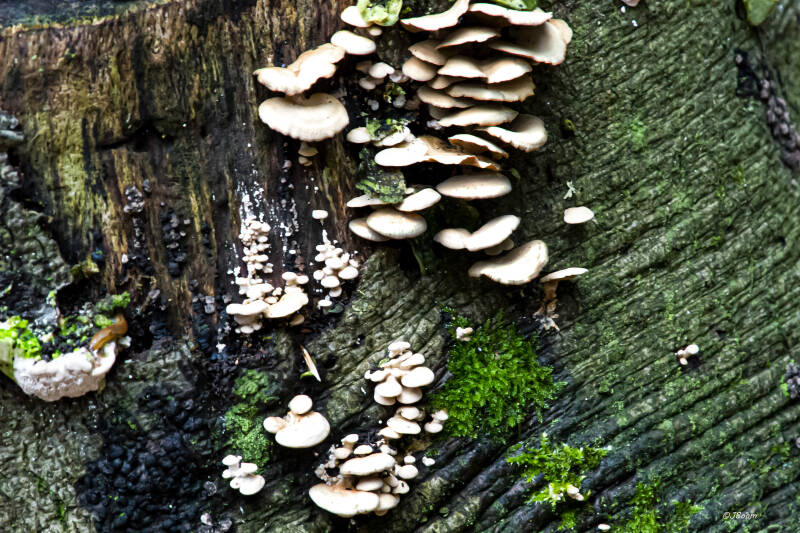 Een afgezaagde boom is een prima biotoop voor de kleine prachtige paddestoelen.