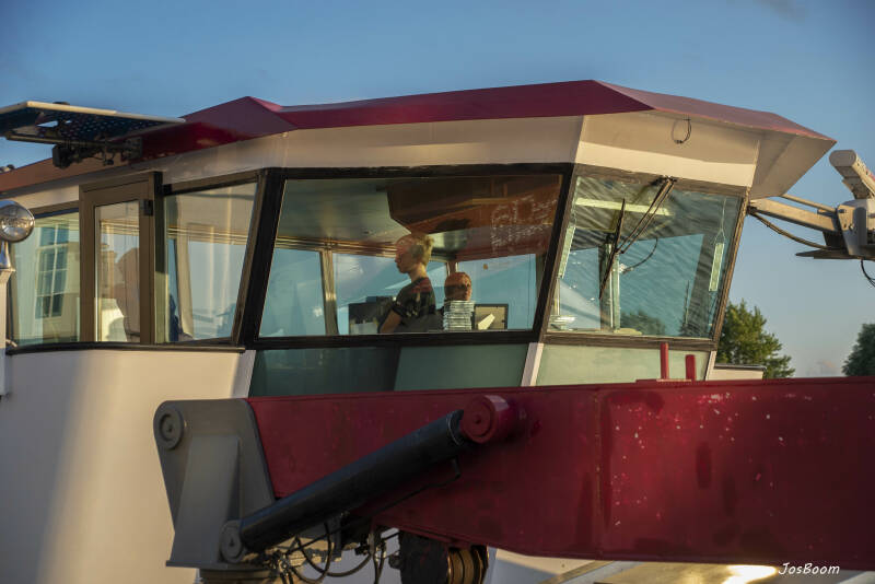 Dat gaat heel mooi, het schip wordt iets naar bakboord gestuurd, vaart dan achterwaards tot aan de kade, daar wordt ze vastgelegd met een tros en vervolgens stuurt de schipper ook de voorkant naar de wal. Klaar is kees. Mooi om naar te kijken