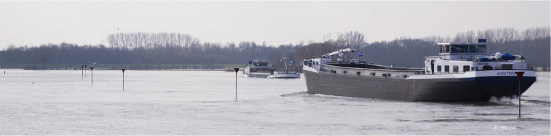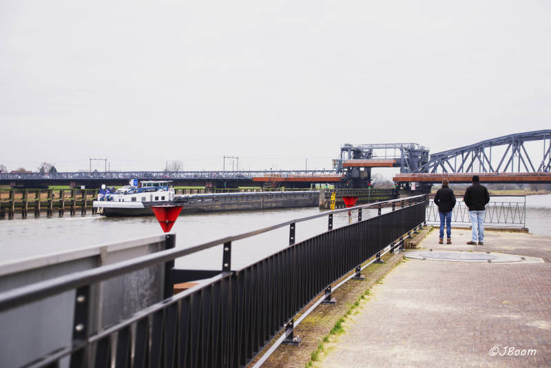 Schip met bouwmateriaal passeert de IJsselbrug bij Zutphen 09-02-2017