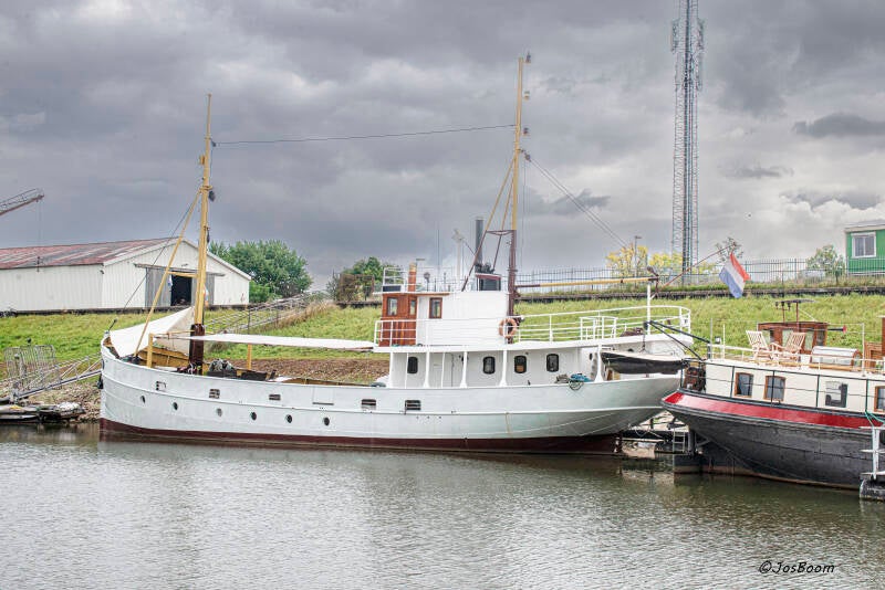 15-06-2020, fietsen langs de IJssel, even uitblazen, mooi oude sleper.