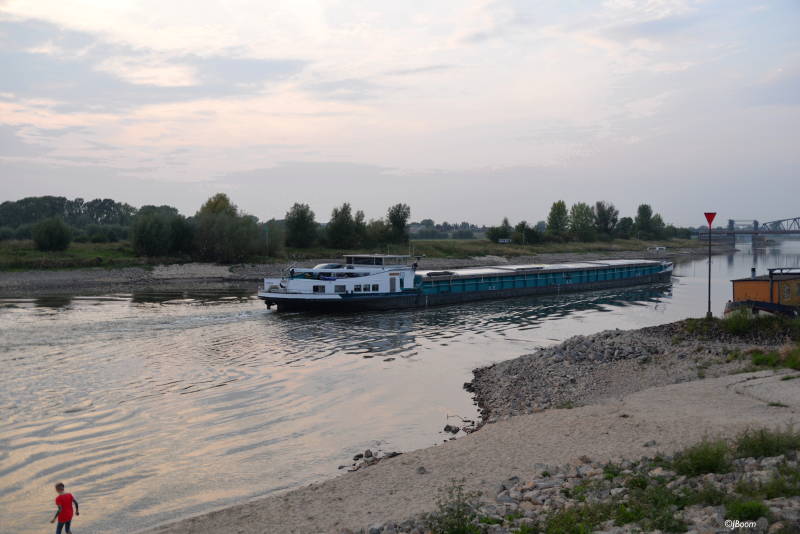 De 1e foto met m'n D610 die ik op m'n site zet. Een nieuwe camera vraagt een poosje oefening. Zomeravond, spelend kind aan de IJssel terwijl een schip passeert.