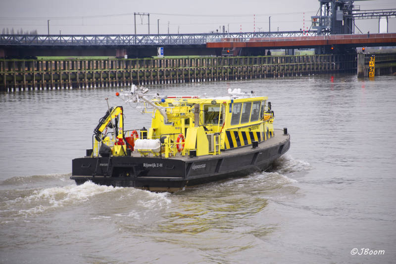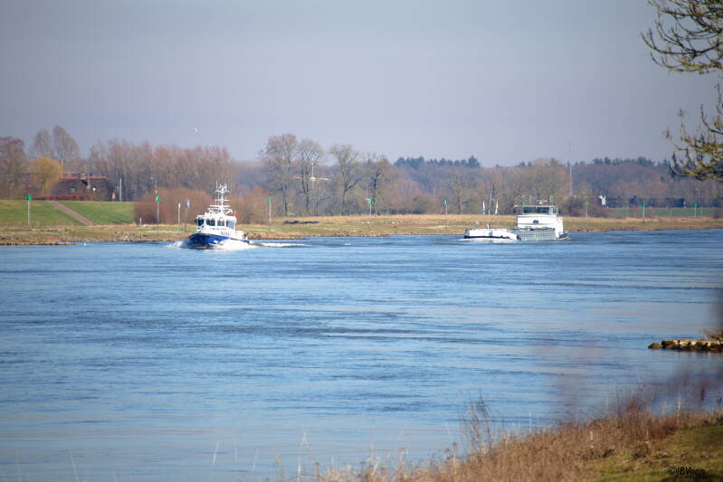 26-02-1019 Op de IJssel bij Olst en Veesen kwam eea voorbij. Hier een politieboot en een rollen staal vervoerend binnenschip.