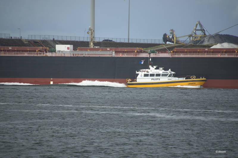 2 bulkcarriers passeren, elkaar, een komt binnen, de ander gaat naar zee.