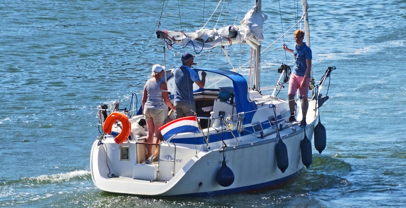 Zeiljacht verlaat de sluizen bij IJmuiden op weg naar de Noordzee