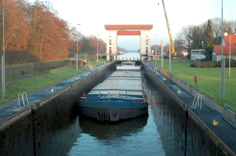 13/12/13 Bij Eefde is de sluis die het Twentekanaal met de IJssel verbindt, schip in oostelijke richting.