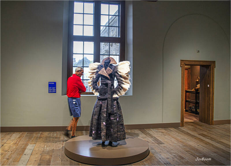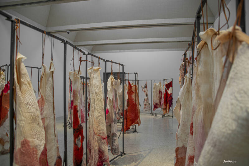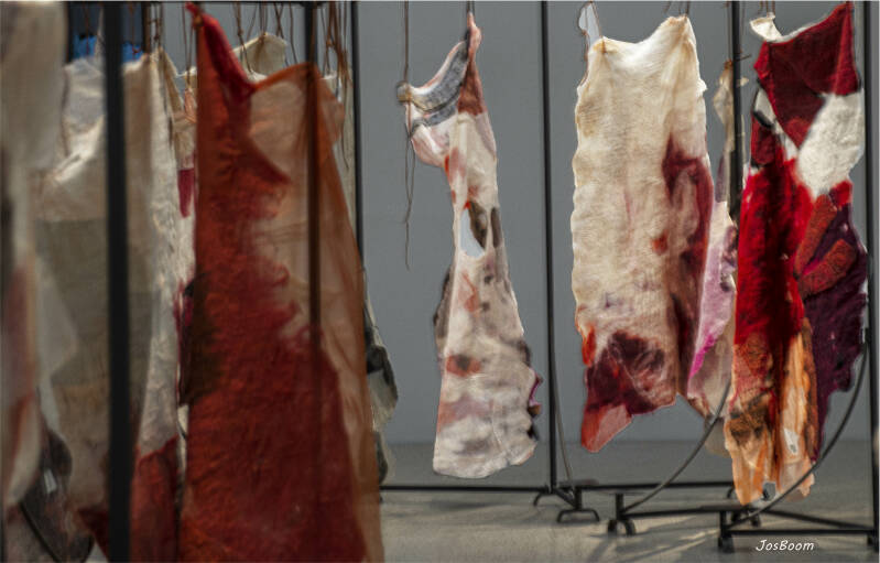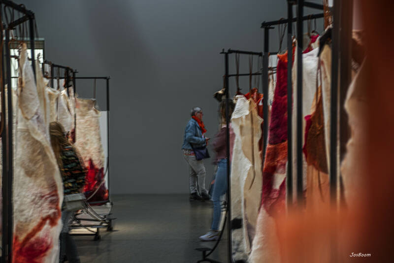 06-08-2021, Dagje Rijnsburg met een bezoek aan Leiden, De Lakenhal. Werk van Claudy Jongstra, veel wol, maar ook andere textiel en leer.