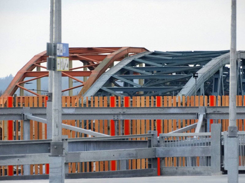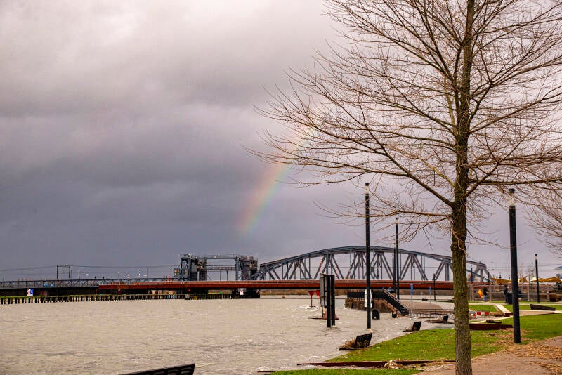 De bruggen liggen iets meer dan 5 km uit elkaar, de windmolens staan zo'n 3 km achter de boogbrug.