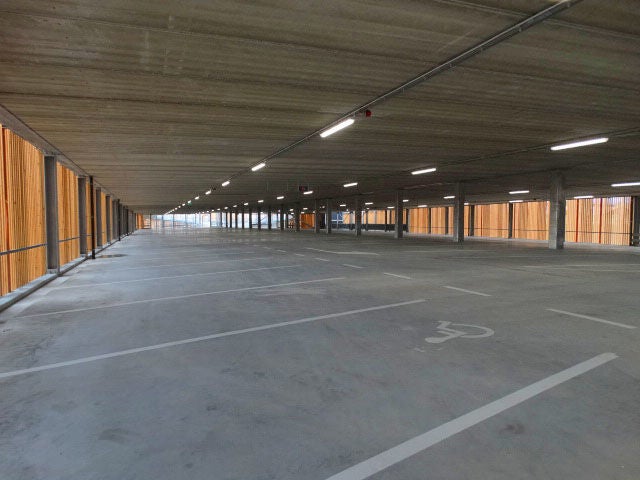 Uitzicht vanaf het dakparkeervlak, twee oude gerestaureerde industriële panden