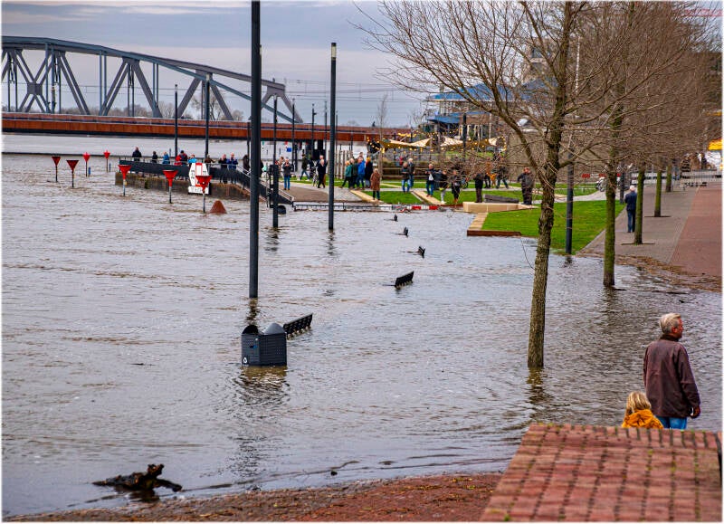 Ook de bankjes aan de jachthaven staan zo'n beetje onder water