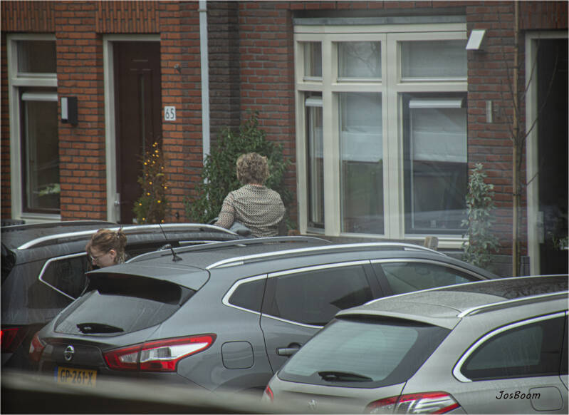 Het busje moet er langs, Christine houd de hond van .... vast zodat de bus er langs kan.