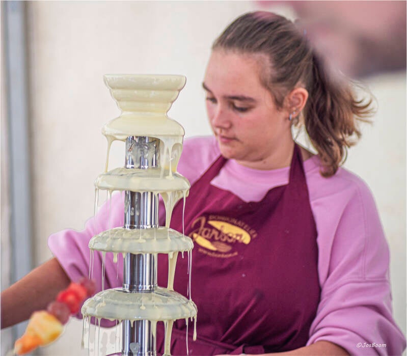 Uit de chocoladefontijn komt vandaag witte chocolade, er mag van gesnoept worden dmv stokjes met bijvoorbeeld fruit.