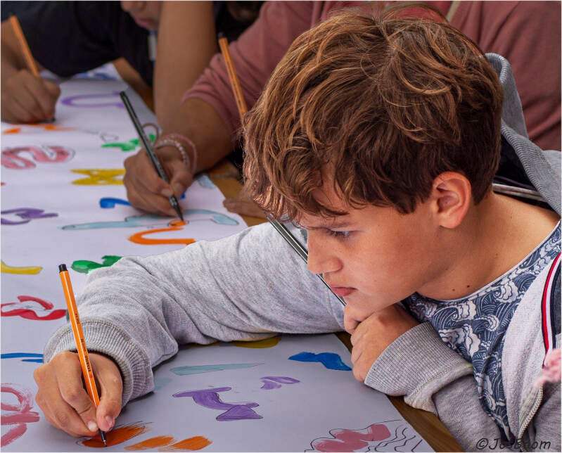 Er kan worden getekend op een lang stuk papier, jong en oud leeft zich uit. Als ik de foto's maak wordt er overgeschakeld naar oranje, dwz dat dan de oranje stukken aan de beurt zijn om verder bewerkt te worden.