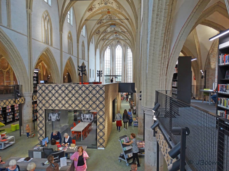 29-07-2017 De Broederenkerk gebouwd in 1293 is al jaren, sinds 1983, nou ja, ongeveer 1/33 van de leeftijd van de kerk, de bibliotheek van Zutphen, na een opknapbeurt ziet de bieb er zo uit.