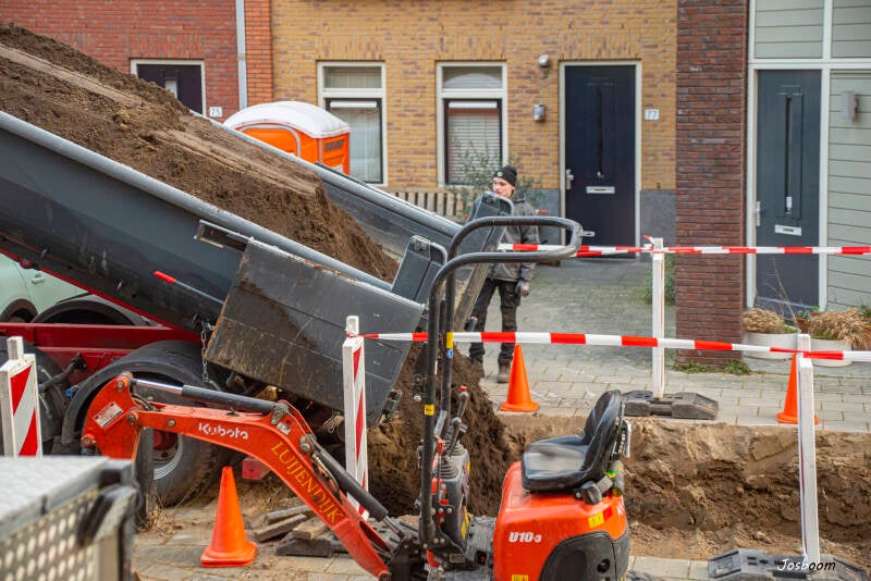 Vrijdag 24/2 begint het met de tegels uit de stoep te halen.. Verderop wordt ook gewerkt, grond wordt even op deze plek gestort.