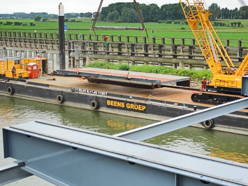 terug bij de brug begint een precisieklus, hijsen en plaatsen gaat stukje bij beetje, er komt heel wat pas- en meetwerk aan te pas.