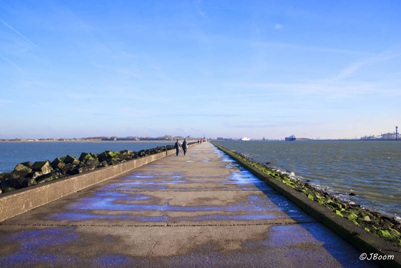 Op weg naar de parkeerplaats, we moeten even met de auto naar de pont,die ligt in de Nieuwe Waterweg, lopen we over het strand, en of het nou koud is of niet, zandkastelen hebben met luchtkastelen gemeenschappelijk dat ze altijd gebouwd kunnen worden. De mussen houden vader en zoon gezelschap