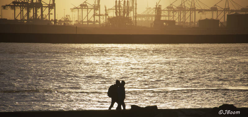 16-01-2020, we hebben geluk, als we opstaan schijnt de zon, zacht warm licht over het strand en de Nieuwe Waterweg.